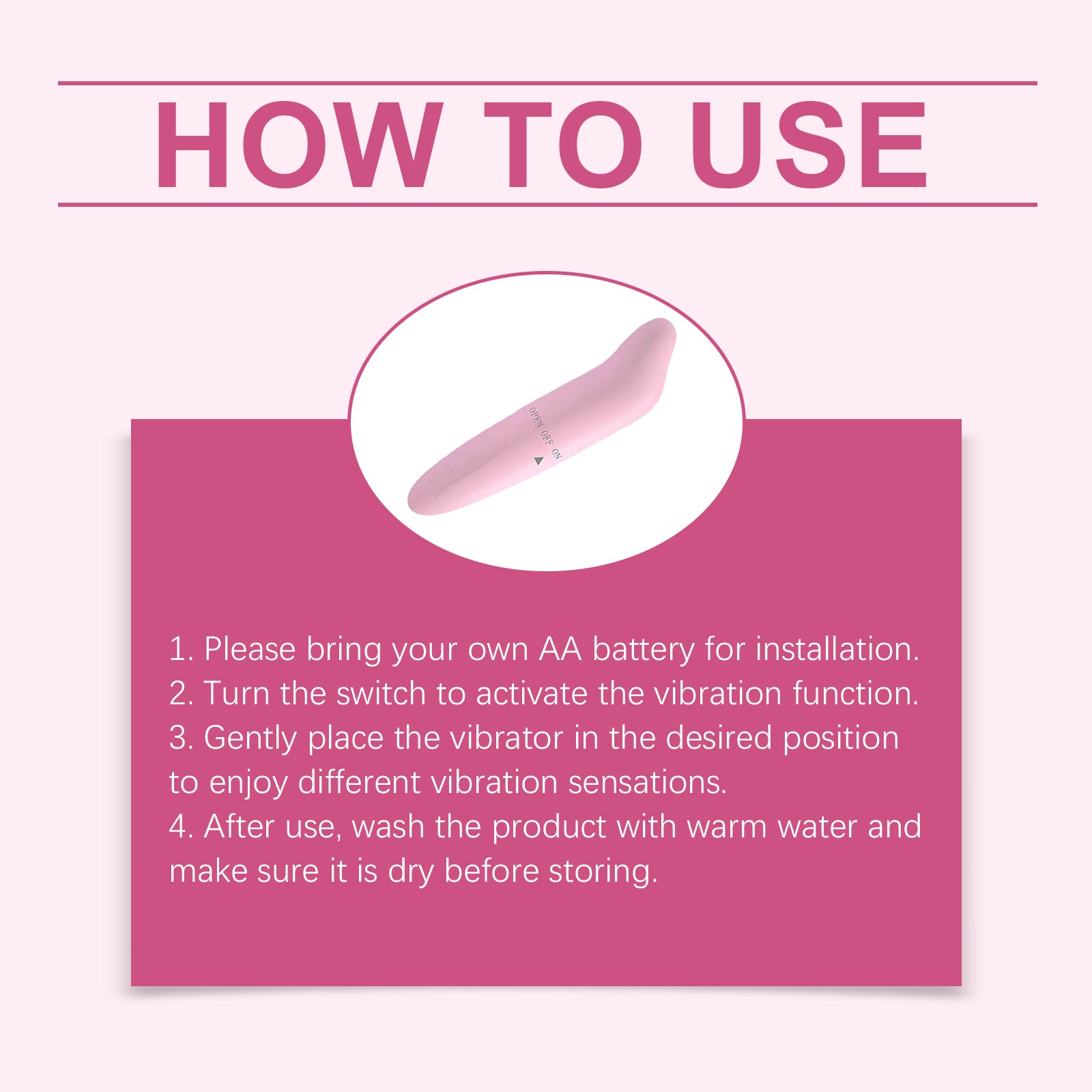 Our sex vibrator contains plastic. It can vibrate modes to meet different needs. Suitable for use alone or for sharing experiences. One key control, easily adjust the vibration intensity. Stylish design, low-key secrecy, easy to carry. Its use method is very simple: 1. Please bring AA battery when installing. 2. Turn the switch to activate the vibration function. 3. Gently place the vibrator in the desired position and enjoy the different vibration sensations. 4. After use, wash the product with warm water and ensure that it is dry before storing. And can be easy to clean, easy daily maintenance. High performance battery, extended use time.